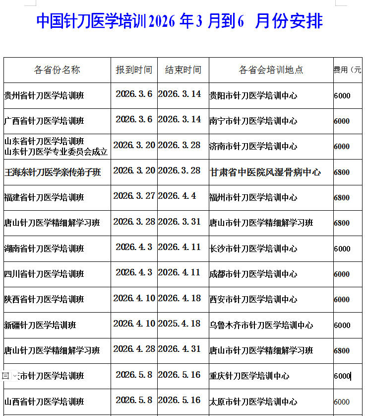为响应国家中医药管理局关于推广及普及中医专业实用技能的通知,为了规范针刀医学临床诊疗技术,普及推广针刀医学治疗实用技能,同时交流各地针刀医学临床诊疗先进经验。世界针刀医学研究会学术部主办,北京萃博针刀医学研究院承办“全国第三十二届针刀医学新进展学习班”( 针刀医学临床操作提高培训班,项目编号BT20241621028),将定于 2026 年3月-6月在中国举办,届时将邀请全国知名针刀医学专家授课,欢迎贵单位组织相关人员参加。